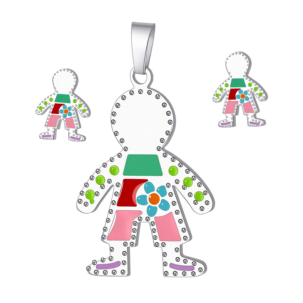 Set šperků obsahuje originální přívěsek a náušnice ve tvaru postavičky. Všechny kusy jsou zdobeny barevnými detaily v různých odstínech, což dodává hravý a veselý vzhled. Tento set je ideální pro každodenní nošení nebo jako zajímavý doplněk na speciální příležitosti. Určeno pro dámy. Zapínání je klasické. Vzor je moderní a stylový, perfektní pro ty, kteří mají rádi kreativní design.