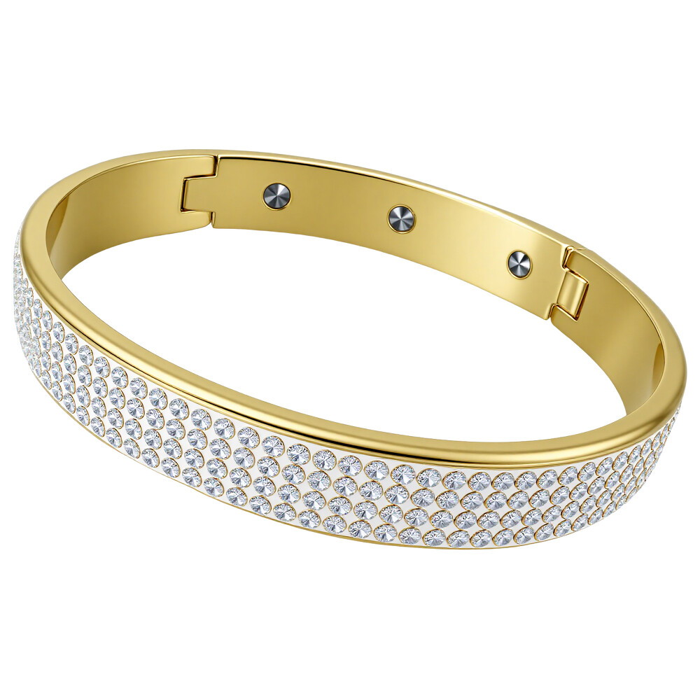 Elegantní náramek v zlaté barvě s ozdobnými krystaly, které dodávají šperku třpytivý vzhled. Průměr náramku je 60 mm, což zajišťuje pohodlné nošení. Ideální pro speciální příležitosti nebo každodenní nošení. Zapínání je na klips, což zaručuje snadnou manipulaci. Tento dámský náramek se skvěle hodí k večerním šatům i k ležérnímu outfitu.