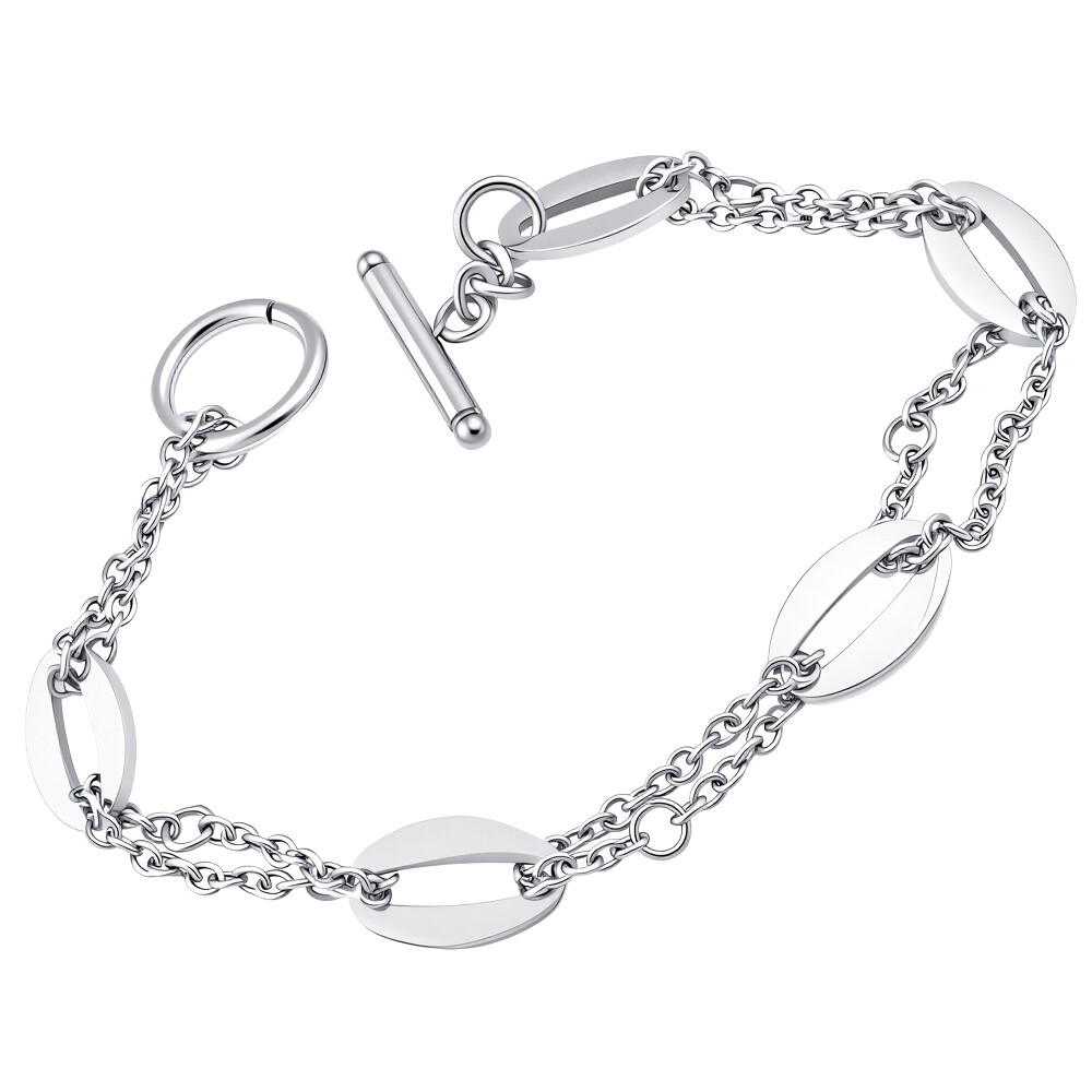stříbrné barvě s elegantním designem, který kombinuje řetízek s oválnými články. Tento náramek je ideální pro každodenní nošení, ale také skvěle doplní elegantní outfit na speciální příležitosti. Jeho jednoduchý, ale stylový vzhled jej činí univerzálním doplňkem, který se hodí do různých situací, od pracovních schůzek po večerní výlety.Náramek obsahuje:
