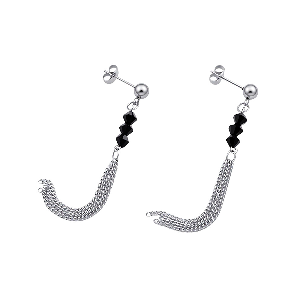 Tyto elegantní náušnice kombinují moderní design s výraznými detaily. Hlavní část náušnic je tvořena stříbrnou barvou, která dodává šperku šmrnc a lesk. Uprostřed náušnic se nachází černé krystaly ve tvaru hranolu, které zaujmou svým vzhledem.