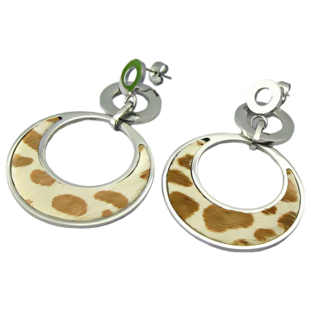 Pár náušnic v moderním designu, které kombinují stříbrnou barvu s originálním vzorem. Tyto náušnice mají kruhový tvar, který je zdoben povrchovou úpravou s leopardím vzorem. Tento styl dodává šperkům jedinečný a trendy vzhled.