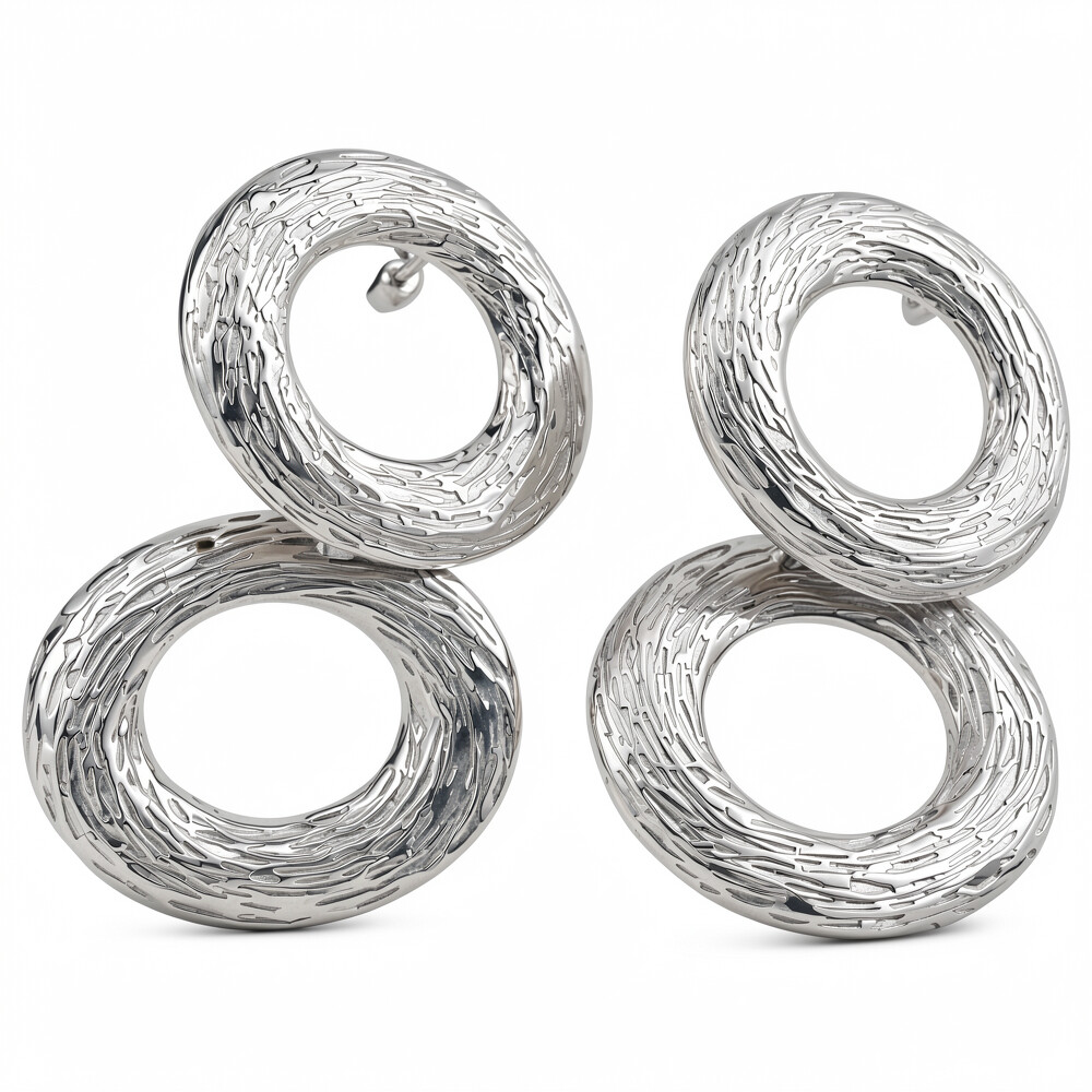 Pár náušnic v stříbrné barvě s elegantním designem, který přitahuje pozornost. Tyto náušnice mají moderní vzhled díky svému kulatému tvaru a jemně strukturovanému vzoru, který dodává šperkům texturu a hloubku.