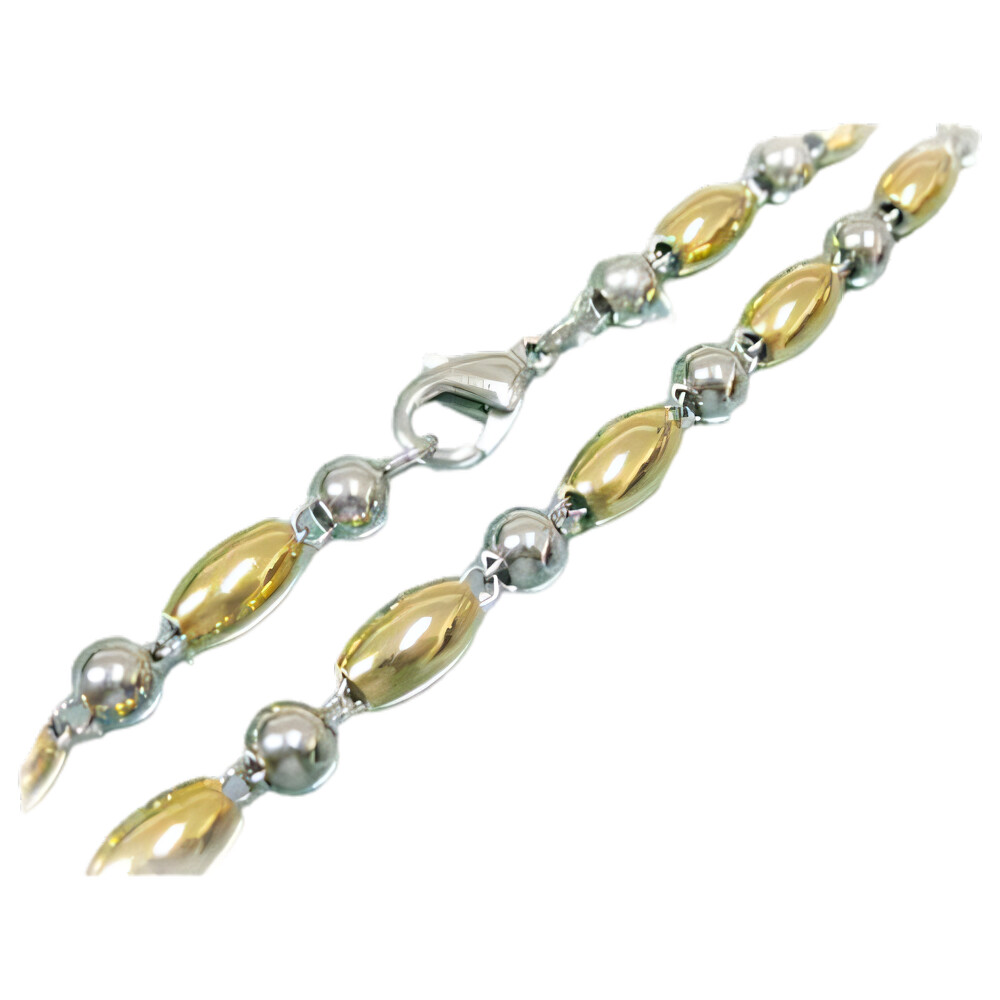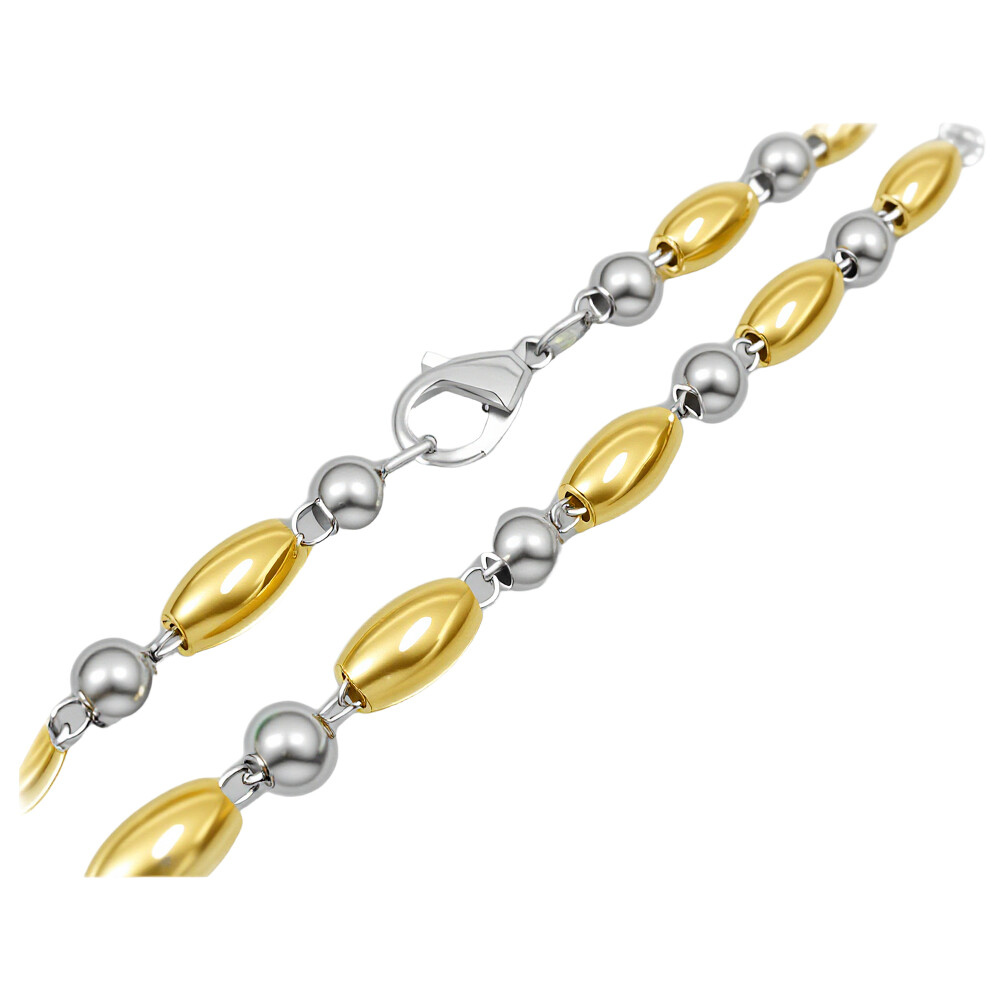 Elegantní náhrdelník v zlaté a stříbrné barvě, který kombinuje lesklé oválné a kulaté články. Tento šperk je ideální pro každodenní nošení i speciální příležitosti, jako jsou večerní akce nebo oslavy. Jeho design dodává nádech elegance a stylu.