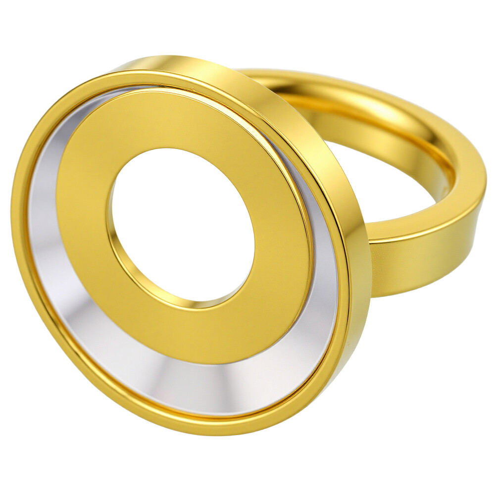 Elegantní prsten ve zlaté barvě s unikátním designem. Středová část zdobí bílý kruh, který dodává šperku vzdušnost a svěžest. Prsten má velikost 22 mm, což ho činí ideálním doplňkem pro každodenní nošení i speciální příležitosti. Zapínání je klasické, takže se snadno nasazuje a sundává. Tento dámský prsten skvěle doplní váš outfit na večerních akcích nebo jako módní kousek do práce.