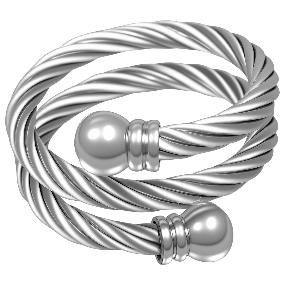 Elegantní ocelový prsten v stříbrné barvě s designem připomínajícím pletený drát. Prsten je zdoben dvěma kulatými prvky na koncích, které dodávají šperku moderní vzhled. Tento univerzální kousek se hodí na každodenní nošení i na speciální příležitosti. Zapínání je otevřené, což umožňuje snadné přizpůsobení velikosti. Ideální pro dámy i pány, kteří ocení styl a pohodlí.
