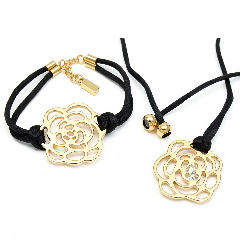 Stylový šperkový set, který zaujme svým elegantním designem. Obsahuje náramek a náhrdelník, oba zdobené krásným květinovým motivem. Náramek je vyroben v černé barvě s výrazným květinovým přívěskem ve zlaté barvě, což vytváří kontrastní a atraktivní vzhled. Náhrdelník má podobný design s menším přívěskem. Tento set je ideální pro různé příležitosti, jako jsou večerní události nebo oslavy, ale hodí se také k běžnému nošení do práce či na schůzky.