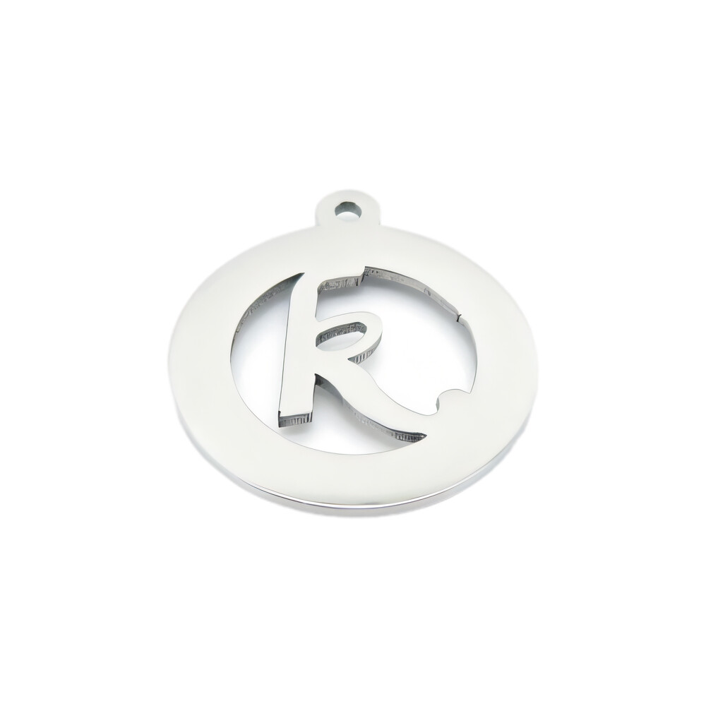 Přívěsek s iniciálou K ve stříbrné barvě, průměr 20 mm, hmotnost 1,8 g.