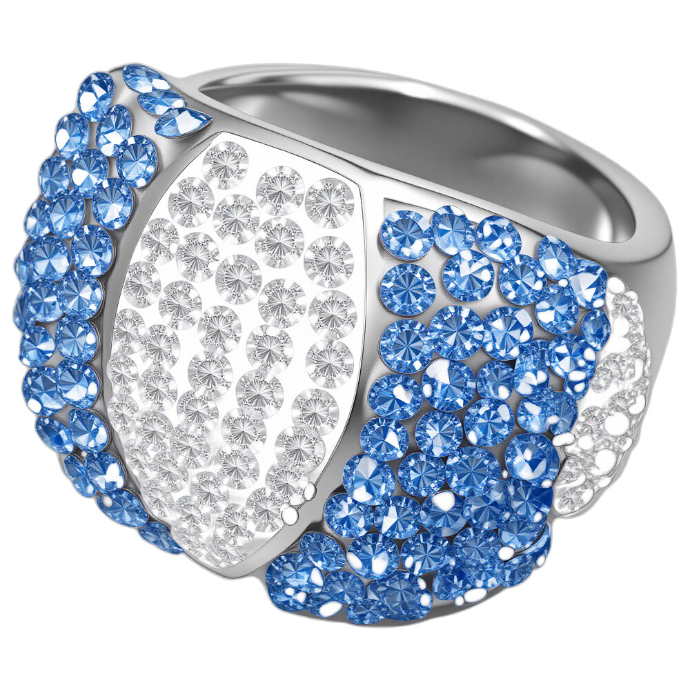 Elegantní prsten s výrazným designem, který přitahuje pozornost. Prsten je zdobený modrými a bílými krystaly, které vytvářejí nádhernou kombinaci barev a tvarů.Tento šperk se skvěle hodí na různé příležitosti, od každodenního nošení po speciální události, jako jsou večírky či oslavy.