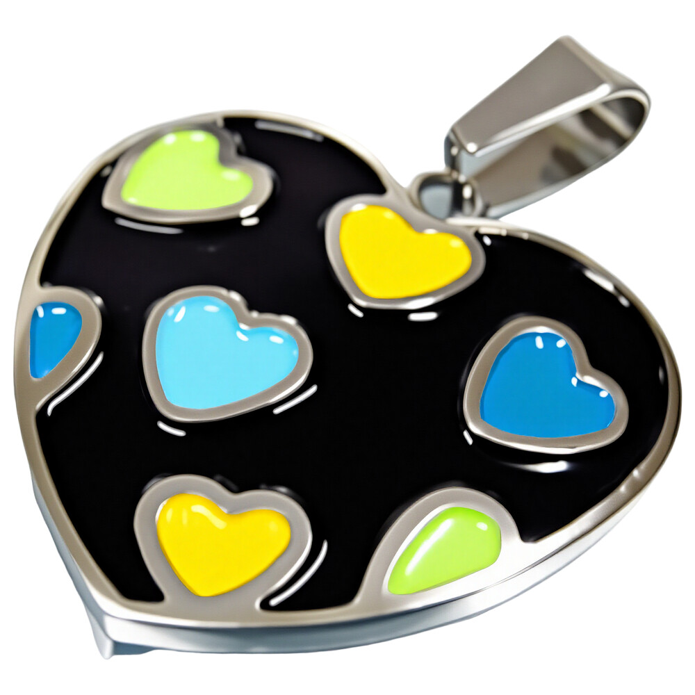 Elegantní srdcový přívěsek v moderním designu, který zaujme svou výraznou barevností a hravým vzorem. Přívěsek je ve tvaru srdce, jehož povrch zdobí barevné srdíčka různých velikostí na černém pozadí. Barevná kombinace zahrnuje modrou, zelenou a žlutou barvu, což dodává šperku živý a radostný vzhled.Tento přívěsek se skvěle hodí pro každodenní nošení i do příležitostních outfitů. Je ideálním doplňkem pro různé akce jako jsou večírky nebo setkání s přáteli.